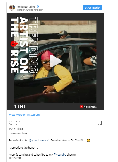 Teni the Entertainer has appeared on YouTube Music as the platform’s Trending Artist on the Rise.