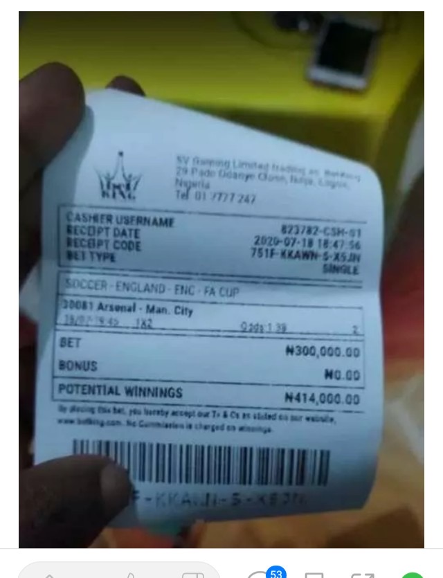 A Nigerian man, whose name a Nairabet owner decided to conceal lost a whopping three hundred thousand Naira betting that defending Champions, Manchester City, would beat Arsenal in Saturday’s English FA Cup semifinal.