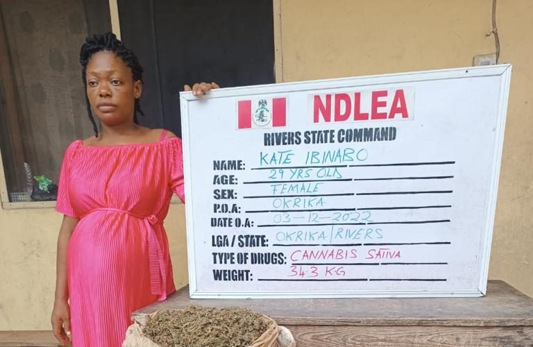 In Rivers state, operatives on Saturday 3rd Dec arrested a 29-year-old pregnant woman, Kate Ibinabo with 34.4kgs cannabis Sativa in the Okrika area of the state.